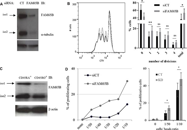 Figure 5: FAM65B expression is inversely correlated with the T cells activation threshold. (A) The efficiency of FAM65B knock-down in human primary T cells was checked by immunoblotting with anti-FAM65B and anti-α-tubulin as a loading control. (B) Human primary T cells were transfected with control (siCT) or FAM65B (siFAM65B) siRNA, then stained with CTV and stimulated in vitro for 3 days using anti-CD3 and -CD28 coated-beads. The proliferation of transfected cells was analyzed by flow cytometry after 3 days of stimulation. The percentage of cells exhibiting 0, 1, 2, 3, 4 divisions or the addition of them (total) is quantified as the mean ± SD obtained from four donors. (C) Naive (CD45RA+) or activated/memory (CD45RO+) populations were purified from peripheral blood T cells. FAM65B expression was then analyzed by immunoblotting. (D) Primary human CD45RA+ T cells transfected with siFAM65B or siCT were stained with CTV and stimulated in vitro using variable doses of anti-CD3 and anti-CD28 -coated beads. The proliferation of the transfected cells was analyzed by flow cytometry after 3 days of stimulation. Results are representative of at least three individual experiments
