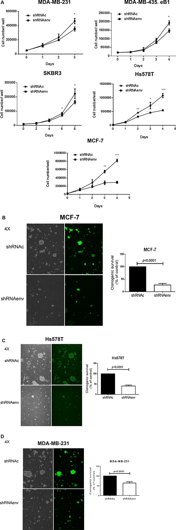 Figure 2: Effect of HERV-K knockdown on cell growth and anchorage-independent growth of BC cells. (A) Significantly reduced cell proliferation, assessed by counting live cell numbers, was observed for MDAMB-231, MDA-MB-435.eB1, SKBR3, Hs578T, and MCF-7 cells (n = 3; unpaired t test), after HERV-K knockdown by shRNAenv. An anchorage-independent growth assay was used to determine cell transformation after transduction with shRNAenv and shRNAc (n = 9; unpaired t test). Reduced colony numbers were demonstrated for MCF-7 (B) (p < 0.0001; 10 days post-seeding), Hs578T (C) (p < 0.0001; 10 days post-seeding), MDA-MB-231 (D) (p < 0.0001; 10 days post-seeding and p = 0.0034; 2 weeks post-seeding).