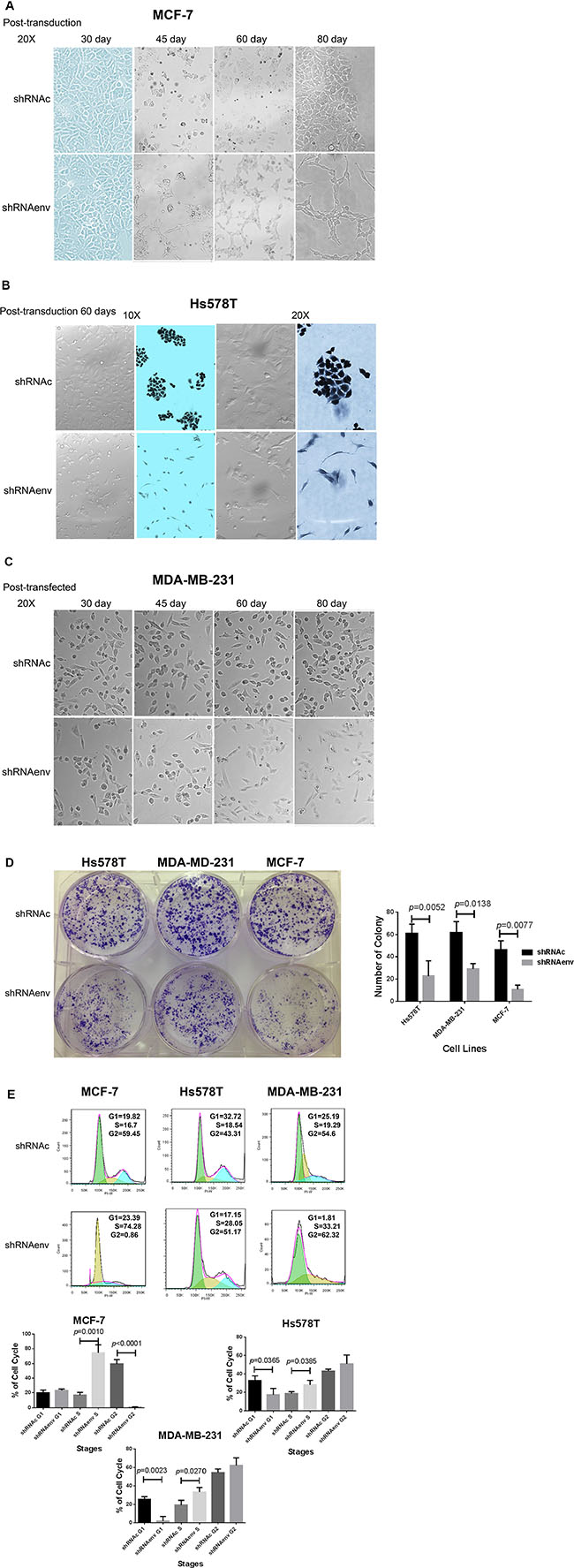 We observed that long-term culture of BC cells transduced with shRNAenv led to slower cell growth rates, which was accompanied by phenotypic changes in MCF-7 cells at day 45 post-transduction (Figure 4A), and in Hs578T at day 60 post-transduction (Figure 4B). The cells transduced with shRNAenv showed a spindle-like elongated phenotype, compared to cells transduced with shRNAc. However, no significant change in phenotype was noted in MDA-MB-231 cells transduced with shRNAenv after similar numbers of days post-transduction (day 30 to day 80; Figure 4C). An image of cells cultured under anchorage-independent growth conditions from the 3 BC cell lines transduced with shRNAenv or shRNAc is shown in Figure 4D. Significantly reduced numbers of colonies and smaller colony sizes were observed in the 3 BC cell lines transduced with shRNAenv compared with shRNAc cells.