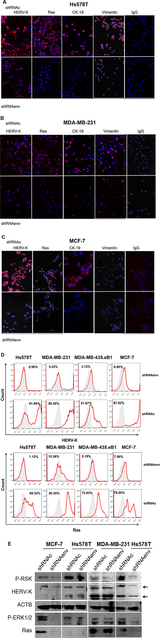 Figure 5: Changes in expression of signaling proteins after shRNA knockdown of HERV-K. IFS was used to detect changes in expression of HERV-K and Ras in Hs578T (A) MDA-MB-231 (B), and MCF-7 cells (C) after HERV-K knockdown. The effect of HERV-K knockdown on expression of proteins involved in EMT, including CK-19 and vimentin was determined in the three BC cell lines. Reduced protein expression was observed for all of these proteins. In addition, decreased Ras protein expression (D, left) was induced by downregulation of HERV-K expression (D, right) in cancer cells transduced with shRNAenv, as assessed by FACS (D). Immunoblot analysis showed reduced expression of p-RSK, p-ERK 1 or 2, and Ras in shRNAenv transduced MCF-7, MDA-MB-231, and Hs578T cells only when there was also shRNAenv-induced reduced expression of HERV-K Env protein in these cell lines (E). ACTB antibody was used as control.