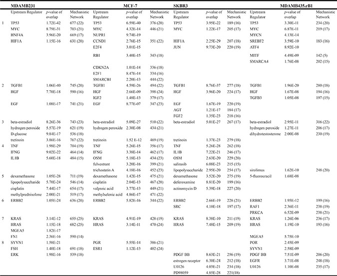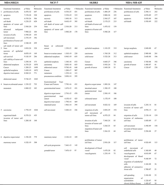 6. Others including Cancer, Organismal Injury and Abnormalities, Reproductive System Disease, Cellular Development, Cellular Growth and Proliferation, and Organismal Survival for MDA-MB-231, or Cancer, Organismal Injury and Abnormalities, Reproductive System Disease, Cell Cycle, and Cancer, Endocrine System Disorders, Organismal Injury and Abnormalities, Reproductive System Disease for MCF-7