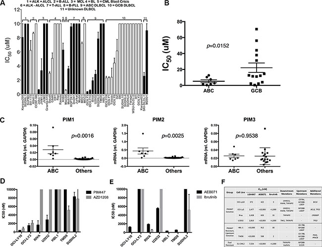 Figure 1: Pan-PIM Inhibition with PIM447 in non-myeloma lymphoid tumor cell lines. (A) IC50 values of cell lines to PIM447. IC50 values determined from luminescent viability with the Cell Titer Glo reagent. Indicated cell lines were treated with serial dilutions of PIM447 for 72 hours. Shown is the mean of four replicates ± SEM. (B) IC50 values of ABC and GCB DLBCL cell lines, compared with two-tailed T test. (C) mRNA expression of PIM1, PIM2 and PIM3 in ABC-derived vs. other DLBCL cell lines, compared with two-tailed T test. qRT-PCR was performed on cDNA isolated from each cell line. 2-ΔΔCT normalized to GAPDH (D) IC50 values calculated from cell viability assays of indicated cell lines, with the top concentration for PIM447 and AZD1208 being 10 μM. Shown is the mean of four replicates ± SEM. (E) IC50 values calculated from cell viability assays of indicated cell lines, with the top concentration for AEB071 being 10 μM and 1 μM for Ibrutinib. Shown is the mean of four replicates ± SEM. (F) ABC DLBCL cell lines, grouped based on drug sensitivity, with known somatic mutations.