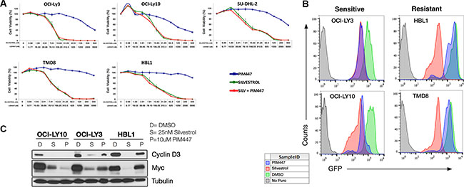 Figure 3: PIM447 treatment leads to a reduction in cap-dependent protein translation in sensitive cell lines. (A) Cell viability assays with PIM447, Silvestrol, and the combination with the top concentration for PIM447 being 5 μM and 500 nM for Silvestrol. Cells were then incubated for 48 hours and viability was assessed using Cell Titer Glo reagent. Shown is the mean of four replicates ± SEM. (B) OPP incorporation after treatment with PIM447. 100,000 cells were plated and treated with either 10 μM PIM447, 100nM Silvestrol or vehicle and incubated for 24 hours. At 23 hours 50 μM OPP was added, then cells were harvested at 24 hours, and an Alexa Fluor 488 azide was attached to the OPP terminated proteins using the Click-iT Cell Reaction Buffer Kit and analyzed by FACS. (C) Translationally regulated proteins are lost after PIM447 treatment in sensitive cell lines. 5,000,000 cells were treated with 25 nM Silvestrol, 10 uM PIM447 or vehicle PIM447 for 16 hours and indicated proteins were analyzed by western blot.