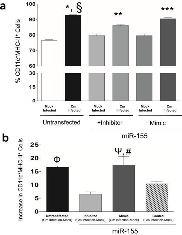 Figure 2: Murine miR-155 regulates expression of Major Histocompatibility Complex II (MHC-II) in Chlamydia muridarum infected dendritic cells. BMDC were pulsed with Cm (MOI = 1) and 24 hrs later MHC-II expression was determined in CD11c+ BMDC using flow cytometry. a. Frequency of CD11c+MHCII+ cells was plotted as % of total cells in Cm or mock infected un-transfected, miR-155 inhibitor or mimic transfected BMDC. Results are representative of 2 independent experiments. P < 0.05 using ANOVA with Bonferroni’s Multiple Comparison Test.*Cm infected animals compared to mock infected; §Cm infected, untransfected compared to Cm infected, miR-155 inhibitor transfected; **Cm infected compared to mock control infected, miR-155 inhibitor transfected; ***Cm infected miR-155 mimic compared to Cm infected, miR-155 inhibitor transfected BMDC. b. Increase in frequency of CD11c+MHCII+ cells following Cm infection relative to respective mock control infection in untransfected, or miR-155 inhibitor, mimic or control (scramble mimic) was determined. Results are representative of 3 independent experiments. P < 0.05 using ANOVA with Bonferroni Multiple Comparison Test*. ΦCm infected-mock wells in un-transfected wells compared to miR-155 inhibitor wells. ΨCm infected mimic compared to miR-155 inhibitor transfected wells. #miR-155 mimic transfected compared to miR-155 control transfected wells.