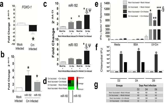 Figure 4: Murine FOXO-1 and miR-182 is significantly regulated in Chlamydia muridarum infected CD4+T cells. C57BL/6 mice (n = 3) were challenged intravaginally with 5 x 104 IFU Cm. Splenocytes were collected at day 12 post infection and CD4+T cells purified. Real time PCR was performed for murine a. FOXO-1; and b. miR-182 and -183. Results are representative of 3 (FOXO-1) and 4 (miR-182 and-183) independent experiments. *P < 0.05 Student’s t test compared to mock control infected mice. GAPDH or Snord 68 and 85 used as housekeeping gene or miRs, respectively. c. C57BL/6 mice (n = 5/group) were vaccinated intranasally with 500 IFU Cm or PBS (mock), rested for a month and subsequent intravaginal infection with 5 x 104 IFU Cm or PBS (mock). Splenic CD4+T cells were purified at day 6 post infection and miR-182 and -183 expression was assessed. Results are representative of 2 independent experiments. P < 0.05 using ANOVA with Tukey-B *compared to mock vaccinated + mock infected mice. §Cm vaccinated + Cm infected compared to Cm vaccinated + mock Infected. ΨCm vaccinated + Cm infected compared to mock vaccinated + Cm Infected mice. d. Non-supervised hierarchical clustergram depicting miR-182 and -183 co-regulation in vaccinated and infected groups. e. ELISPOT revealed significant increase in antigen-specific IFN-γ /106 splenocytes in Cm vaccinated + Cm infected compared to other groups at day 6 post Cm infection. P < 0.05 using ANOVA with Tukey-B P < 0.05*,**,*** compared to mock vaccinated + mock infected mice. §Cm vaccinated + Cm infected compared to Cm vaccinated + mock infected control. f. Bacterial shedding; g. Percent mice positive for Cm in all groups (n = 5/group) was monitored and robust protection was observed in Cm vaccinated + Cm infected compared to mock vaccinated + Cm infected mice (P < 0.05 = Φ). ND = Not detected. Dotted line indicates below the level of detection.