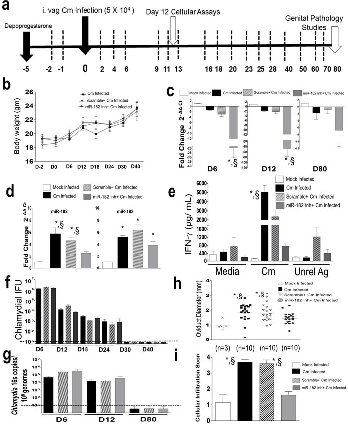 Figure 5: Murine miR-182 significantly regulates Ag-specific immune responses and disease pathology in Chlamydia muridarum infected mice. C57BL/6 mice (n = 16/group) were challenged intravaginally with 5 x 104 IFU Cm. a. Using a i.p depletion regimen, miR-182 was depleted using miR-182 inhibitor or controls (scramble treated, mock treated) at each of the time points indicated by dashed lines b. Monitoring of weight on indicated days revealed no significant changes due to treatment. P < 0.05 using ANOVA with repeated measures. Significant regulation in miR-182 expression in c. genital tract (down-regulation compared to mock) and d. splenic CD4+T cells (up-regulation compared to mock) collected at indicated time points (n = 3/ group/ time point) was observed. P < 0.05 using ANOVA with Tukey B Comparison Test in c., * miR-182 inhibitor treated Cm infected mice compared to Cm infected mice; § miR-182 inhibitor treated Cm infected mice compared to scramble treated Cm infected mice and d. significant increase in miR-182 and miR-183 expression * compared to mock infected mice; § compared to miR-182 inhibitor treated Cm infected mice. e. Splenocytes (n = 3) were collected at day 12 post infection and IFN-γ was measured 72 h post co-culture. Results are representative of 5 independent experiments. P < 0.05 using ANOVA with Bonferroni’s Multiple Comparison Test * Cm infected mice compared to mock infected mice. §Cm infected mice compared to miR-182 inhibitor treated Cm infected mice. f. Bacterial shedding, g. tissue bacterial burden qPCR of Chlamydia 16s encoding gene (at indicated time points), h. oviduct pathology and i. total cellular infiltration were evaluated in all groups of mice. Each dot is representative of an oviduct. Results are representative of 2 independent experiments. Kruskall-Wallis test was used for comparing bacterial shedding profiles and histopathology. P < 0.05 * compared to mock infected mice. § compared to miR-182 inhibitor treated Cm infected mice. Dotted line indicates below the level of detection.