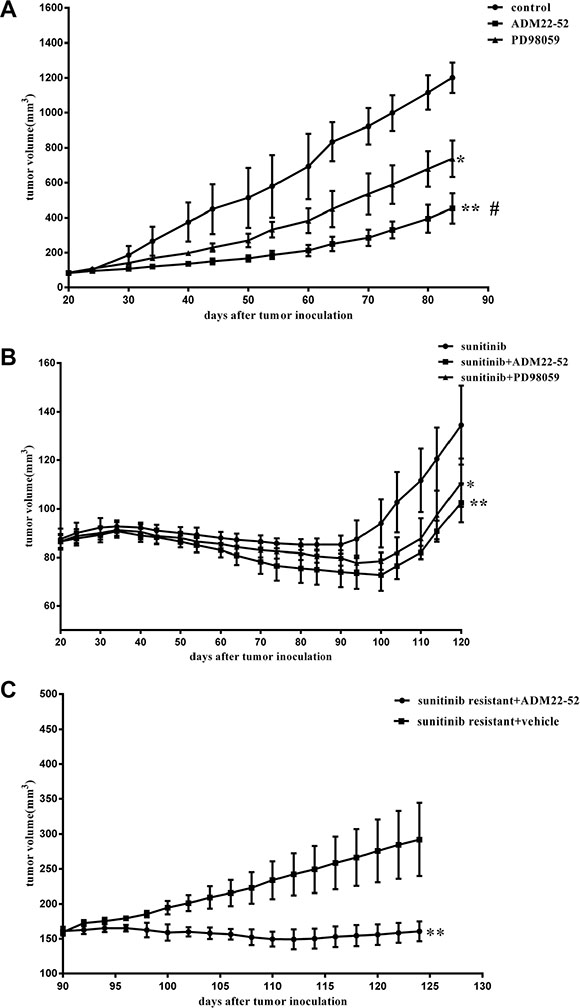 Figure 2: Effects of sunitinib, ADM22-52, PD98059 on the growth rates of mice RCC xenografts. (A) and (B) Mice bearing tumors (4 mice/group) were treated with sunitinib, vehicle (control), ADM22-52, PD98059, sunitinib+ADM22-52, or sunitinib+PD98059 for an indicated number of days. Mean tumor volumes at specific time points are shown. Tumor volumes in the groups treated with sunitinib+ADM22-52 or sunitinib+PD98059 were compared to those in the groups treated with sunitinib. Tumor volumes in the groups treated with vehicle, ADM22-52, or PD98059 were compared to those in the groups treated with vehicle. (C) ADM22-52 inhibited sunitinib-resistant xenograft growth. 786-0 xenograft tumors were treated with sunitinib daily until phenotypic resistance developed. Then, the mice were randomly divided into two groups. One group was given sunitinib plus ADM22-52 (4 mice), and the others were given sunitinib plus vehicle (4 mice). ADM22-52 treatment began on day 90 and ended on day 130. Tumor volumes were monitored, and the results showed that sunitinib plus ADM22-52 treatment inhibited tumor growth compared with sunitinib plus vehicle treatment. Data are expressed as the mean ± SD (*p < 0.05; **p < 0.01. #comparison between the ADM22-52 group and PD98059 group, p < 0.05).