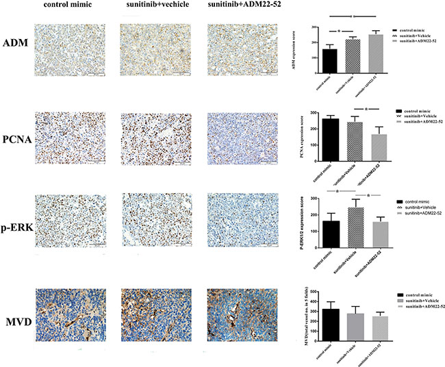 Figure 3: Elevated ADM, PCNA and p-ERK1/2 expression levels were noted in mice RCC xenografts that were resistant to anti-angiogenesis agents (sunitinib). Quantitative immunohistochemistry analysis and representative microscopic fields of ADM, PCNA, p-ERK1/2 staining and MVD (× 200). Columns, data are expressed as the mean ± SD, generated as described in the Materials and methods (*p < 0.05; **p < 0.01).