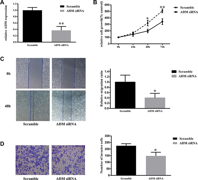 Figure 4: Down-regulation of ADM inhibited 786-0 cell proliferation, migration and invasion. (A) Knockdown of ADM expression using siRNA decreased ADM expression. RNA was extracted from 786-0 cells transfected with ADM siRNA or scrambled control siRNA control for 3 days and analyzed via qRT-PCR. ADM mRNA levels were used for comparison. (B) Cell viability assay showed that ADM knockdown resulted in a significantly lower cell proliferation rate in 786-0 cells than in negative control cells. (C) Wound healing assay showed that ADM knockdown resulted in significantly lower migration capacity in 786-0 cells than in negative control cells. (D) Transwell invasion assay showed that ADM knockdown resulted in significantly lower invasion capacity in 786-0 cells than in negative control cells. The results are expressed as the mean ± SD for three replicate determinations. *P < 0.05, **p < 0.01.