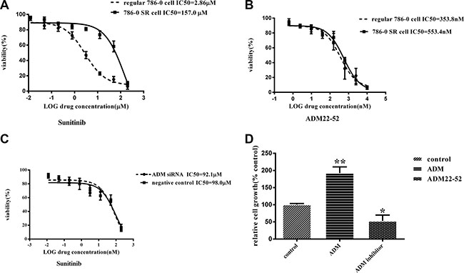 Figure 5: The effects of treatment with sunitinib or ADM22-52 on 786-0 cell growth in vitro. (A) Regular 786-0 cells and 786-0SR cells were treated with the indicated doses of sunitinib(concentration ranged from 200 μM to 0.012 μM). (B) Regular 786-0 cells and 786-0SR cells were treated with the indicated doses of ADM22-52(concentration ranged from 200 μM to 0.012 μM). (C) 786-0SR cells transfected with ADM siRNA or its scrambled control, and then were treated with the indicated doses of sunitinib(concentration ranged from 200 μM to 0.012 μM). (D) The effects of ADM (10–7M) and ADM22-52(10-6M) on regular 786-0 cell growth in vitro. After 72 h of incubation, cell growth was determined in triplicate for all of the above experiments. Bars, mean ± SD. (*P < 0.05; **P < 0.01).