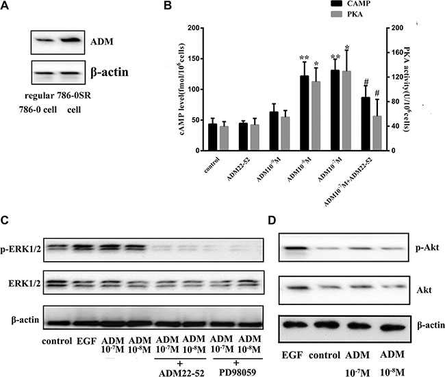 Figure 6: The ERK/MAPK pathway was induced by ADM in 786-0 cells. (A) ADM expression was increased in 786-0SR cells. (B) Effects of ADM on cAMP levels and PKA activity. ADM induced cAMP formation and increased PKA activity in a dose-dependent manner in cultured 786-0 cells compared to the control group. Cells were treated with ADM at concentrations of 10-7-10-9 M or ADM22-52 (10-6 M) for 2 hours. Bars (mean ± SD) represent three independent experiments (*P < 0.05; **P < 0.01, #comparison between the ADM (10-7 M) group and ADM22-52 (10-6 M)+ADM (10-7 M) groups, p < 0.05). (C) Cells were treated with ADM (10-7–10-8 M) for 2 h, and then cell lysis proteins were immunoblotted for phospho-ERK1/2, ERK1/2 and β-actin expression. PD98059 and ADM22-52 inhibited ADM-induced phosphorylation of ERK. EGF (5 ng/ml) was used as positive control known to stimulate ERK1/2 phosphorylation. Pre-incubation of the cells with ADM22-52 (10-6 M) or PD98059 (10 mmol/l) for 30 min inhibited ADM-induced phosphorylation of ERK1/2. β-actin was used as a loading control. (D) The intracellular signaling pathway associated with Akt expression in 786-0 cells treated with/without ADM.