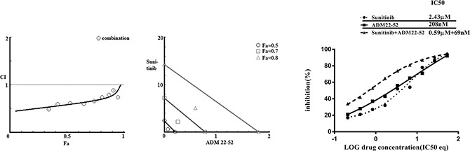 Figure 7: Combination treatment with sunitinib and ADM22-52 in 786-0 cells. Left: Combination index (CI) analysis. Data for the combined treatment indicated that the curve was below 1, which was indicative of synergy. Middle: Isobologram analysis. At Fa = 0.5, 0.7 and 0.8, all the data points for the combination treatment were below the additivity line, which was indicative of synergy. Right: Curve-shift analysis. The combined treatment curves were shifted to the left, which indicated that synergy was achieved via the combination of sunitinib and ADM22-52.