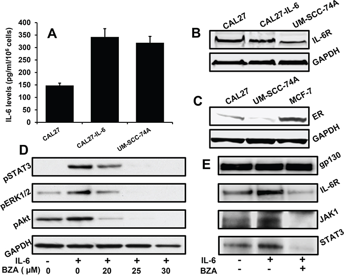 Figure 2: Bazedoxifene inhibits IL-6 signaling by blocking IL-6R and gp130 interactions. A. CAL27, CAL27-IL-6 and UM-SCC-74A cells were cultured in 6 cm dishes. After 72 hours, culture supernatants were collected and IL-6 levels assayed by ELISA (R&D Systems). B. Whole cell lysates for CAL27, CAL27-IL-6 and UM-SCC-74A cells were Western blotted for IL-6R expression. Equal protein loading was verified by stripping the blot and reprobing with GAPDH. C. Whole cell lysates for CAL27 and UM-SCC-74A cells were Western blotted for ER expression. Equal protein loading was verified by stripping the blot and reprobing with GAPDH. D. CAL27 cells were treated with different concentrations of bazedoxifene (BZA) in serum free medium for 2 hours and then treated with IL-6 (50 ng/ml). After 30 minutes, whole cell lysates were prepared and Western blotted for pSTAT3, pERK1/2 and pAkt. Equal protein loading was verified by stripping the blot and reprobing with GAPDH. E. CAL27 cells were treated with IL-6 in the presence or absence of bazedoxifene (25 μM). After 30 minutes, whole cell lysates were prepared and gp130 immunoprecipitated. Proteins bound (IL-6R, JAK1 and STAT3) to gp130 were analyzed by Western blotting.