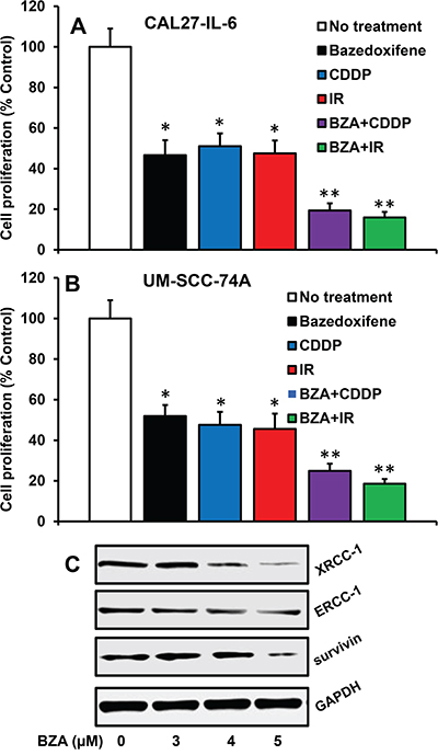 Figure 3: Bazedoxifene reverses cisplatin and radiation-resistance by downregulating XRCC-1, ERCC-1 and survivin. A-B. CAL27-IL-6 (A) cells orUM-SCC-74A cells (B) were treated with the respective IC50 dose of bazedoxifene (BZA), cisplatin (CDDP) or radiation (IR) either alone or in combination and cell proliferation assessed by MTT assay. The percentage cell proliferation for each treatment group was calculated by adjusting the untreated group to 100%. C. CAL27 cells were treated with IL-6 in the presence or absence of bazedoxifene (BZA). After 24 hours, whole cell lysates were prepared and Western blotted for ERCC-1, XRCC-1 and survivin. Equal protein loading was verified by stripping the blot and reprobing with GAPDH.