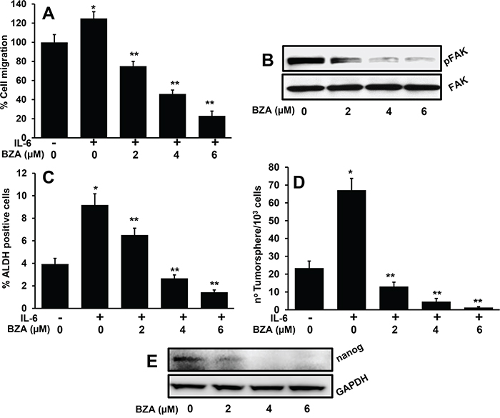 We had recently shown that IL-6 promotes tumor cell migration by regulating the FAK activation [18]. Results from this study show that BZA treatment significantly decreased tumor cell migration in a dose-dependent manner (Figure 4A). In addition, we also observed a dose-dependent inhibition of FAK phosphorylation (Figure 4B). IL-6 signaling plays a critical role in cancer stem cell phenotype [40, 52]. We next examined if BZA treatment could decrease IL-6-mediated stemness phenotype in cancer cells. Indeed, BZA treatment significantly decreased the proportion of ALDH positive cells (Figure 4C) and the number of tumorsphere formed (Figure 4D). Nanog is one of the key stem cell transcription factors that plays an important role in cancer stem cell phenotype [53, 54]. BZA treatment significantly decreased nanog expression in cancer cells as well (Figure 4E).