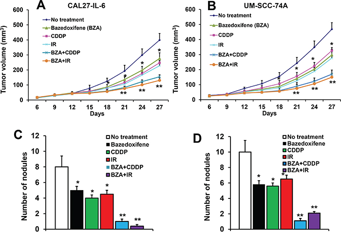Figure 6: Bazedoxifene significantly decreased tumor growth and tumor metastasis. Animals bearing CAL27-IL-6 and UM-SCC-74A tumors were treated with bazedoxifene (BZA, 5 mg/kg/twice a week), cisplatin (CDDP, 5 mg/kg/twice a week) or radiation (IR, 3 Gy/twice a week) either alone or in combination. A-B. Tumor growth curves for CAL27-IL-6 (A) and UM-SCC-74 (B). Number of metastatic nodules in animals bearing CAL27-IL-6 C. and UM-SCC-74A D. *, represents a significant difference (p<0.05) as compared to no treatment group and **, represents a significant difference (p<0.05) as compared to single treatment groups.