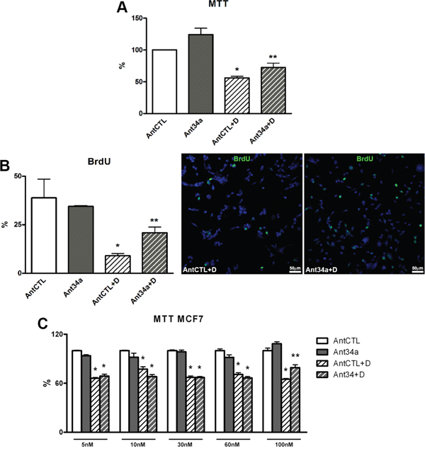 Figure 2: Effect of Ant34a on DOXO-treated rCPCs and cancer cells. A. rCPC viability was determined by MTT assay after miR-34a inhibition followed by DOXO exposure. B. BrdU incorporation assay shows the rate of rCPCs proliferation after treatment with Ant34a and DOXO. BrdU positive cells (green) were showed in representative pictures, nuclei were counterstained with DAPI (blue). C. Effects of Ant34a increasing concentrations on vitality of MCF7 exposed to 0.5 μM DOXO for 24h. Results are presented as mean ± SD. *p<0.05 vs AntCTL; **p<0.05 vs AntCTL+D. Ant34a: antimiR-34a; AntCTL: Ant34a negative control; D: DOXO.