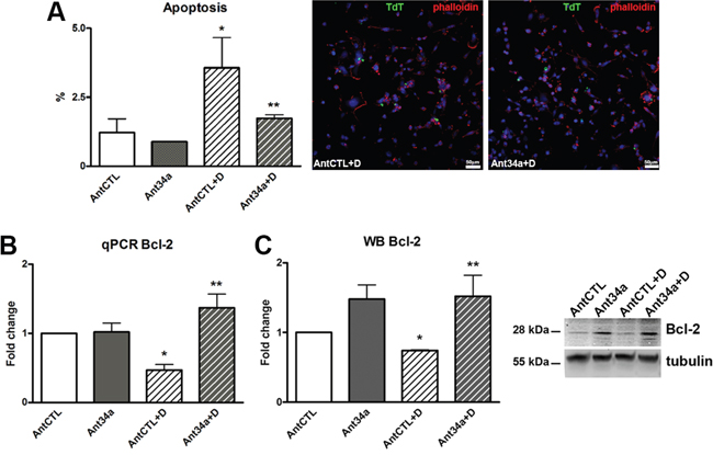 Figure 3: Role of miR-34a in apoptosis of DOXO-exposed rCPCs. A. Apoptosis was evaluated by TdT assay in rCPCs treated with Ant34a and DOXO; apoptotic cells (green) were showed in representative pictures, nuclei were counterstained with DAPI (blue) and cell cytoskeleton with fluorochrome-conjugated phalloidin (red). B. Bcl-2 mRNA levels were analysed by qPCR. C. Western blot analysis shows Bcl-2 protein levels. Results are presented as mean ± SD. mRNA and protein expressions are shown as fold change with respect to AntCTL. *p<0.05 vs AntCTL; **p<0.05 vs AntCTL+D. Ant34a: antimiR-34a; AntCTL: Ant34a negative control; D: DOXO.