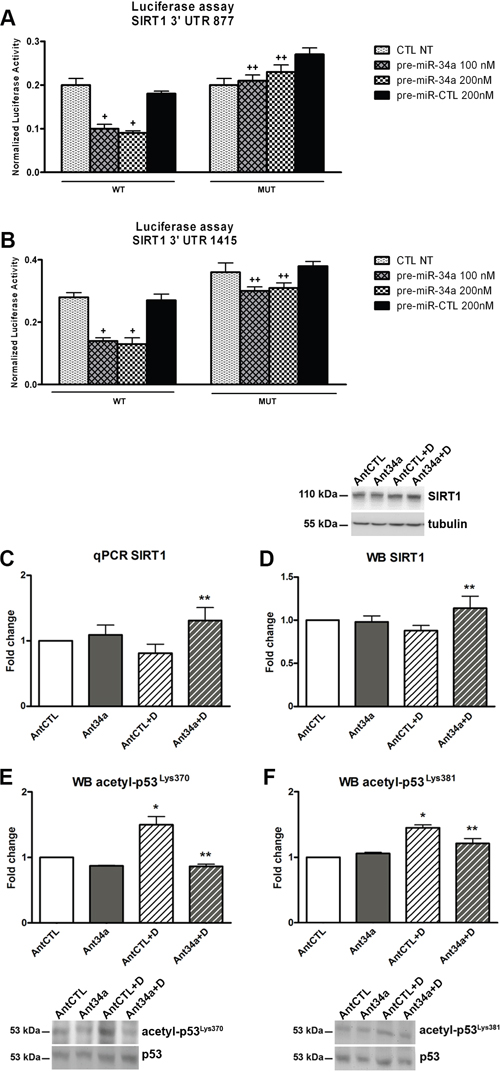 Figure 4: MiR-34a modulation of SIRT1-p53 pathway in DOXO-exposed rCPCs. A. Luciferase activity assay for SIRT1 3’UTR 877 and B. SIRT1 3’UTR 1415 at 24h. Results are expressed as normalized luciferase activity. C. SIRT1 mRNA levels analysed by qPCR. D. Western blot analysis shows SIRT1 protein levels. E. Acetyl-p53Lys370 expression levels were evaluated by western blot. F. Analysis of acetyl-p53Lys381 expression levels. Results are presented as mean ± SD. mRNA and protein expressions are shown as fold change with respect to AntCTL. +p<0.05 vs CTL NT; ++p<0.05 vs corresponding WT conditions; *p<0.05 vs AntCTL; **p<0.05 vs AntCTL+D. CTL NT: no treated control; WT: Wild Type; MUT: mutated; Ant34a: antimiR-34a; AntCTL: Ant34a negative control; D: DOXO.