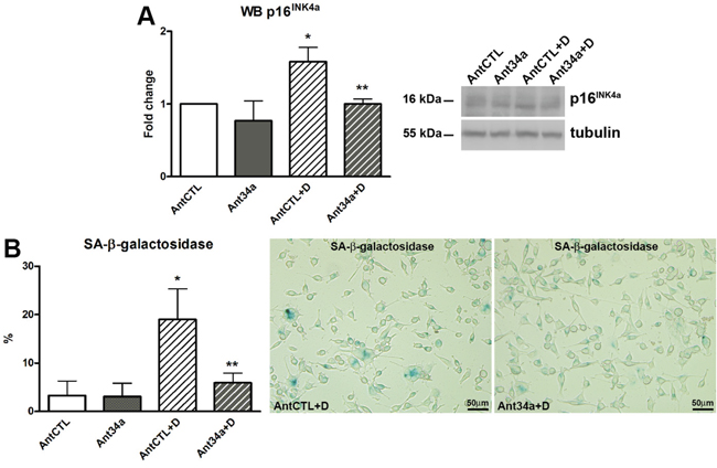 Figure 5: MiR-34a involvement in cell senescence of DOXO-treated rCPCs. A. Western blot analysis of p16INK4a. B. SA-β-galactosidase assay was performed to identify senescent rCPCs after miR-34a inhibition and DOXO exposure; senescent cells (light blue) were showed in representative pictures. Results are presented as mean ± SD. Protein expressions are shown as fold change with respect to AntCTL. *p<0.05 vs AntCTL; **p<0.05 vs AntCTL+D. Ant34a: antimiR-34a; AntCTL: Ant34a negative control; D: DOXO.