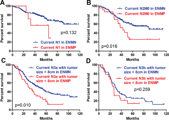 Because ENM was currently counted as the metastatic lymph nodes in the N determination according to JGCA, we adopted this recommendation and defined the current N stage as the combination of metastatic lymph nodes and ENM to evaluate the prognostic differences between ENMN and ENMP patients in the same current N stages. Current N0 stage was not analyzed because there was no ENMP patients. In other current N stages, we compared the baselines of current N1, N2, N3a and N3b stages. In order to balance the baseline (like M stage, tumor size), we only compared the differences in current N1 stage, current N2M0 stage, current N3a stage with tumor size <8cm, and current N3b stage with tumor size <8cm (Table 4). Although there were no significant prognostic differences in current N1 stage (p=0.132) (Figure 7A) and current N3b stage with tumor size <8cm (p=0.259) (Figure 7D), the trends of ENMN and ENMP patients in these two current N stages should not be ignored. Kaplan-Meier analyses indicated that the prognostic differences were significant in current N2M0 stage (p=0.016) (Figure 7B) and current N3a stage with tumor size <8cm (p=0.010) (Figure 7C), indicating that it was more reasonable to categorize ENM as an independent factor but not lymph nodes.