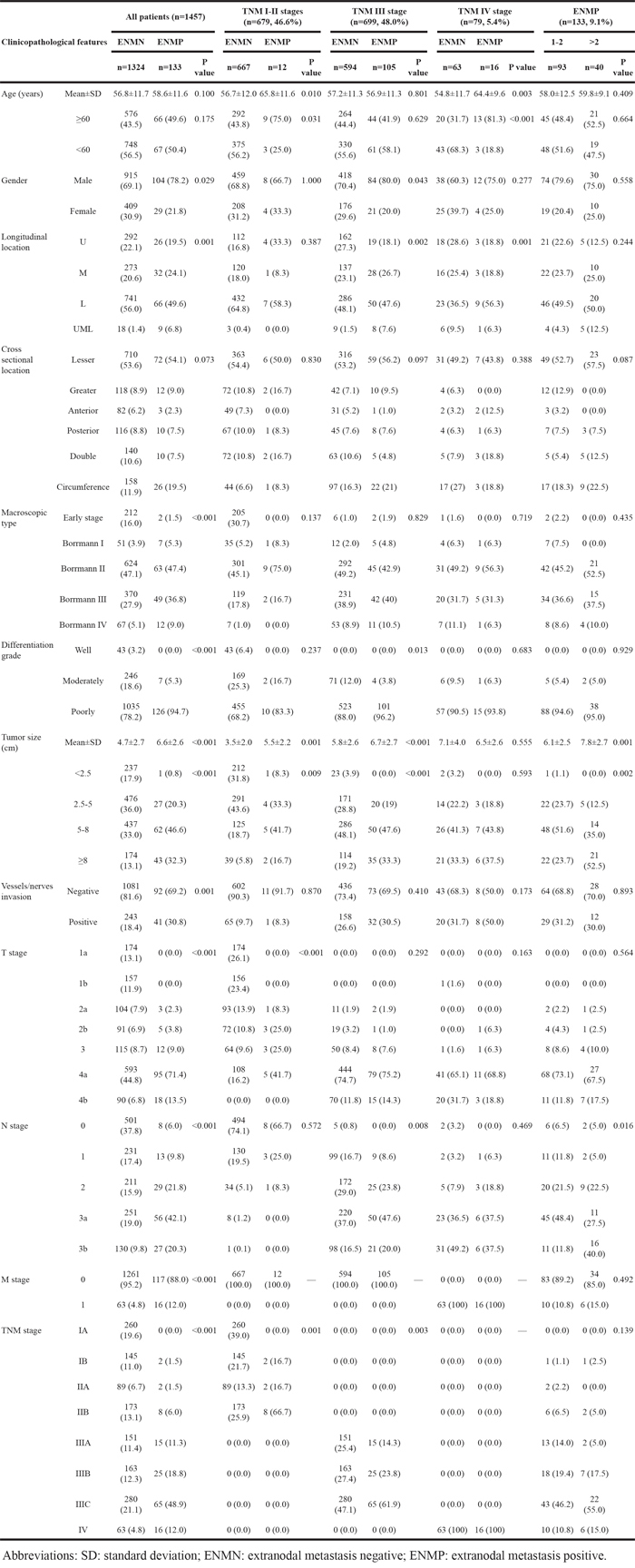 Gastric carcinoma (GC) is one of the most common malignancies in the world [1]. It is well known that lymph nodes are the main metastatic route of GC. Therefore, lymphadenectomy has been considered as one of the crucial procedures in surgery in order to prevent tumor recurrence and metastasis. In the postoperative pathological examination, the histology and number of lymph nodes from the specimen are the main objects. Besides the lymph nodes, some tumor nodules without histological evidence of lymph node structure within the lymphatic drainage extent may also been found, which are recorded as extranodal metastasis (ENM) with the incidence approximately 13% [2-3]. In the Japanese classification of GC according to Japanese Gastric Cancer Association (JGCA), ENM is currently recommended to be counted as a metastatic lymph node in the N determination [4]. Some studies also reported the similar result, indicating that ENM should be incorporated in N stage [5]. However, the role of ENM in TNM stage is still under debate. Some studies found that the prognosis of patients with ENM was similar to that of patients with TNM stage IV, suggesting that ENM should be categorized as M1 or N3 stage [3]. Although it is still controversial of the role of ENM, many reports showed that patients with ENM had worse prognosis than those without ENM, even in early GC [2, 5-7]. Nevertheless, the role of the number of ENM was investigated only in few studies [3]. Besides, many studies had relative small sample sizes or were only limited in lymph node positive patients [8, 9]. A detailed research of ENM in GC is still expected. The researches on ENM within regional lymph nodes station might help to establish a better staging classification system or supply the important revision suggestion to the current TNM stage of GC. The aim of this present study was to research the prognostic significance and the role in TNM stage of ENM within regional lymph nodes station in GC.
