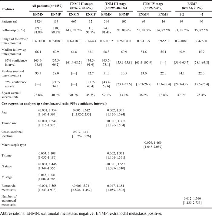 In conclusion, the patients in ENMP subgroup had more advanced GC and worse prognosis than those in ENMN subgroup. Because of the different prognosis, ENM within regional lymph nodes station might not be counted as metastatic lymph nodes in N stage. And it might be more reasonable to categorize ENM>2 into TNM IV stage.