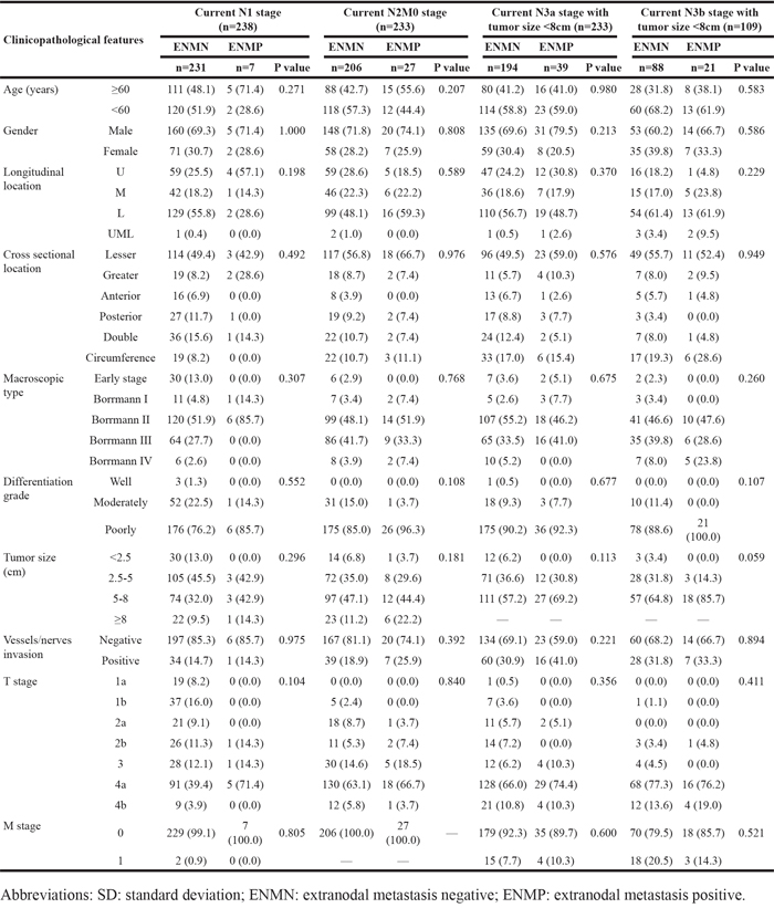 Table 4: Clinicopathological features of extranodal metastasis negative and positive groups in different current N stages in this study