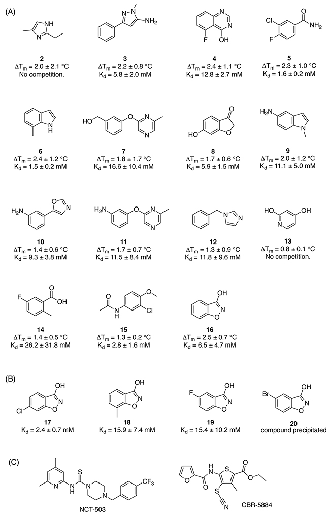 Figure 3: Screening hits and elaborated hit molecules for PHGDH. A. Structures are presented for the subset of hits identified by primary DSF screen that were further evaluated in an ITC competition experiment. B. Modified fragments from the initial screening that were subsequently evaluated in an ITC competition experiment. C. Structures of reported PHGDH inhibitors CBR-5884 and NCT-503.
