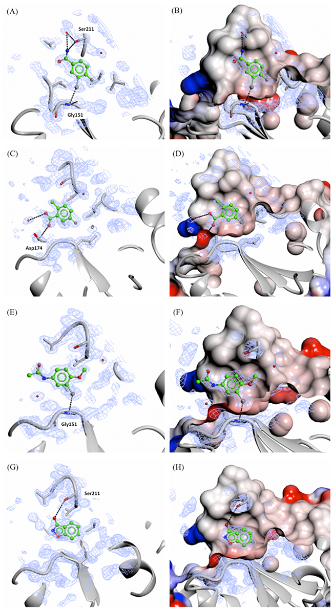Figure 5: X-ray crystal structures of fragments forming specific hydrogen and/or halogen bonds with PHGDH. Crystal structures of bound fragment 5 (A. and B., 1.53 Å resolution), 14 (C. and D., 1.53 Å resolution), 15 (E. and F., 1.53 Å resolution) and 16 (G. and H., 1.33 Å resolution) are shown. The Fo-Fc omit electron density maps are shown as green wire at contour levels of 0.5 electrons/Å3. The left-hand panels show the protein as a grey ribbon representation with selected side-chains drawn as sticks with carbon atoms in grey. The right-hand panels show the protein surface coloured by electrostatic potential.