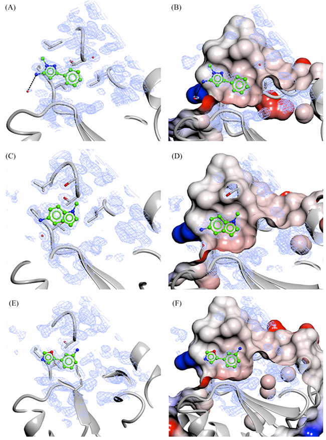Figure 6: X-ray crystal structures of fragments not showing specific interactions bound to the adenine-subsite of PHGDH. Crystal structures of bound fragment 3 (A. and B., 1.33 Å resolution), 9 (C. and D., 1.53 Å resolution) and 10 (E. and F., 1.53 Å resolution) are shown. The Fo-Fc omit electron density map is shown as green wire at contour levels of 0.5 electrons/Å3. The left-hand panels show the protein as a grey ribbon representation with selected side-chains drawn as sticks with carbon atoms in grey. The right-hand panels show the protein surface coloured by electrostatic potential.