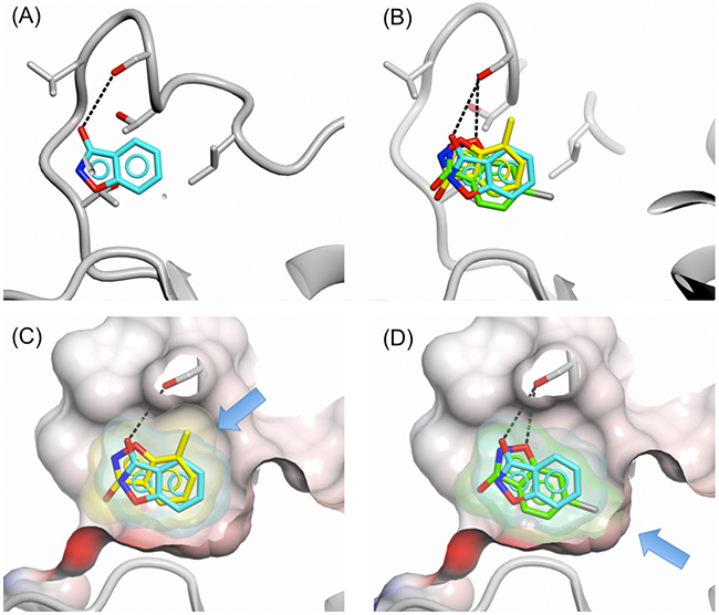 Figure 7: Binding of 3-hydroxybenzisoxazole and analogues with substituents at positions 5 and 7. Binding of fragments 16 (cyan), 17 (yellow) and 18 (green) to the adenine-binding pocket of PHGDH-93. A. Fragment 16, B. fragments 16, 17 and 18, C. fragments 16 and 18, D. fragments 16 and 17. The protein is shown in ribbon representation in grey together with the protein surface coloured by electrostatic potential. The compound surfaces are coloured to match the carbon atoms of the respective fragment. Hydrogen bonds are shown as dashed lines. Blue arrows in pictures (C) and (D) highlight the position of the introduced substituents compared to parent fragment 16.