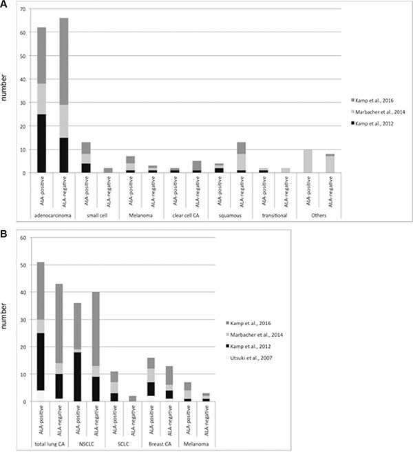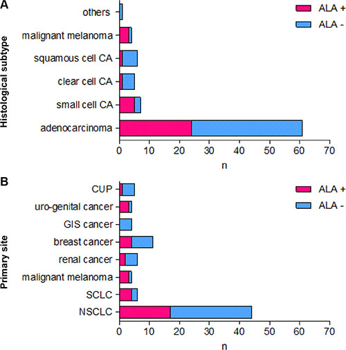 Figure 2: 5-ALA-derived fluorescence behavior of cerebral metastases according to their histological subtype and the primary site. Figure 2 shows the 5-ALA-derived fluorescence behavior of cerebral metastases according to their histological subtype (A) and the primary site (B).
