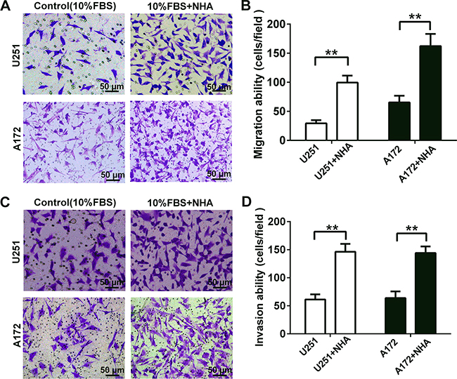 Figure 1: Human astrocytes significantly increase the migration and invasion of glioma cells by releasing soluble factors in vitro. A. Representative micrographs of migratory cells in transwell migration assay containing U251 or A172 glioma cells (4 × 104) in co-culture with astrocytes as indicated. NHA or DMEM containing 10% FBS (as the control) were added to the bottom chamber. Glioma cells suspended in serum-free DMEM were seeded in the upper chamber. After incubation for 24 h, cells which migrated through transwell membrane were fixed, stained and quantified. B. Graphic representation of the quantification of three independent experiments each using five random fields. C. Representative micrographs of invasive cells in transwell invasion assays (plus Matrigel). Glioma cells (8 × 104) were seeded as indicated and co-cultured with NHA for 48 h. D. Graphic representation of the quantification of invasive cells. All data are shown as the mean ± SD of three independent experiments; ** p < 0.01; ***p < 0.001.