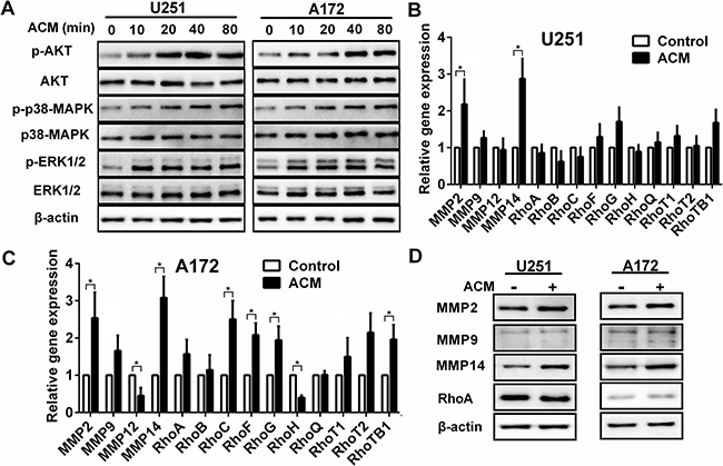 Figure 2: The activated signaling pathways and upregulation of gene and protein associated with invasion induced by astrocytes. A. Western blot analysis of protein lysates prepared from U251 or A172 exposed to astrocytes condition medium (ACM) for the times indicated. B, C. Graphic representations of qRT-PCR results for invasion related gene expression changes induced in U251 or A172 in co-culture with astrocytes. Total RNA was extracted from U251 or A172 glioma cells were incubated with ACM for 48 h where DMEM containing 3% FBS was used as the control. * p < 0.05. D. Western blot analysis performed with protein lysates prepared U251 or A172 cells after incubation with ACM for 48 h. Proteins examined are indicated.