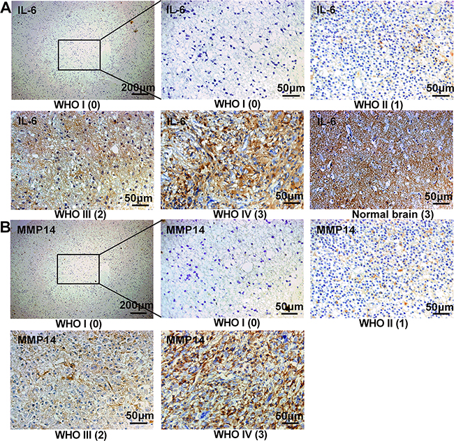 Figure 5: IL-6 and MMP14 are highly expressed in high grade gliomas from patients. Immunohistochemistry and staining scores of IL-6 and MMP14 in different WHO grade glioma. Serial sections were used in individual cases for staining with each antibody. The number in brackets below the image is the immunohistochemistry staining score (0-3). Normal brain with a score of 3 had a high expression of IL-6 (A).