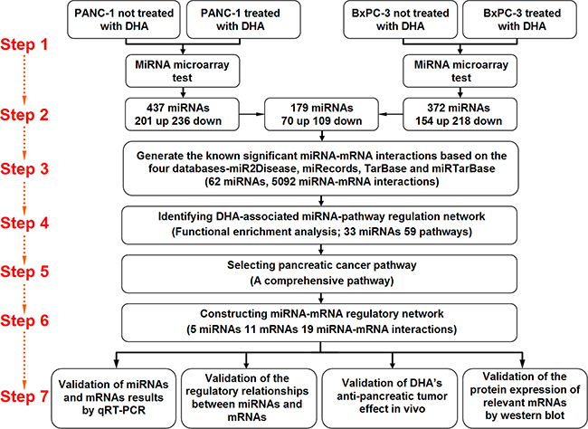 As shown in Figure 1, a multi-step approach was used to identify differentially expressed microRNAs that were up-regulated by DHA and, in turn, the mRNAs regulated by these miRNAs, in two pancreatic cancer cell lines. First, PANC-1 and BxPC-3 pancreatic cancer cells were treated with DHA or vehicle, and the microRNAs that were differentially expressed between the treatment groups were identified using microarrays. 179 differentially expressed microRNAs were identified using two standards: first, the microRNAs were up- or down-regulated with a fold-change in expression ≥ 1.5; second, the microRNAs were differentially expressed similarly in both PANC-1 and BxPC-3 cell lines. Next, microRNA-mRNA interactions were identified using the miR2Disease, miRecords, TarBase, and miRTarBase databases; only microRNAs with confirmed target relationships in these databases were examined further. Based on the microRNA-mRNA interaction data, a DHA-associated microRNA-pathway regulatory network was identified, and the “pancreatic cancer pathway” specifically was selected for further investigation. Five microRNAs, 11 mRNAs, and 19 microRNA-mRNA interactions identified in the pancreatic cancer pathway were investigated to determine their roles in the mechanisms underlying the anti-pancreatic cancer effects of DHA. The differentially expressed microRNAs and mRNAs identified in this way were measured in vitro and in vivo using qRT-PCR, and levels of the protein products of these mRNAs were measured in vitro and in vivo using western blots. ThemicroRNA-target mRNA regulatory relationships selected by microarray and systematic analysis were confirmed with western blots in vitro. Finally, the anti-tumor effects of DHA were examined in vivo by measuring tumor sizes and via immunohistochemistry.