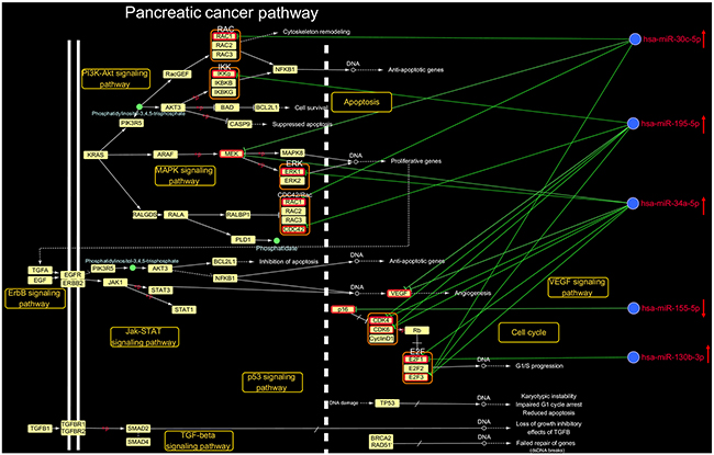 To investigate the mechanisms by which DHA exerts anti-pancreatic cancer effects, we examined the pancreatic cancer pathway identified in the DHA-associated microRNA-pathway regulation network. The comprehensive pancreatic cancer pathway includes the PI3K-Akt, MAPK, ErbB, Jak-STAT, VEGF, p53, and TGF-β signaling pathways, as well as cell cycle and apoptosis pathways. A detailed examination of the microRNA target sites in the pancreatic pathway map is shown in Figure 3. Eleven key pancreatic cancer pathway mRNAs were regulated by 5 microRNAs. For example, miR-34a-5p regulated Cdk4, and miR-195-5p regulated CDC42; both miR-34a-5p and miR-195-5p were up-regulated by DHA and co-regulated Cdk6, VEGF, E2F3, and Cdk4; the up-regulated microRNA miR-30c-5p regulated Rac1, and co-regulated MEK1 with miR-34a-5p and E2F3 with miR-34a-5p and miR-195-5p; the up-regulated microRNA miR-130b-3p co-regulated E2F1 with miR-34a-5p; and the down-regulated microRNA miR-155-5p regulated p16.