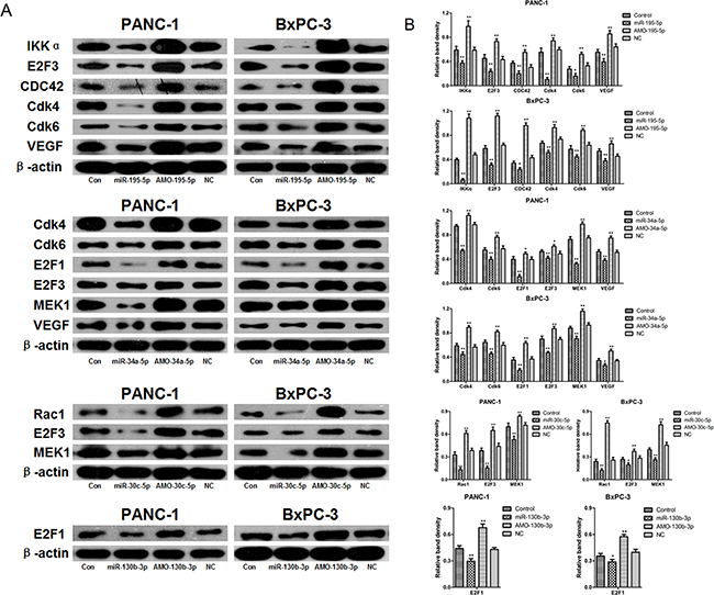 Figure 4: Confirmation of regulatory relationships between microRNAs and target mRNAs by western blot. A. PANC-1 and BxPC-3 cells were transfected with miR-34a-5p, miR-195-5p, miR-30c-5p, miR-130b-3p, AMO-34a-5p, AMO-195-5p, AMO-30c-5p, AMO-130b-3p, or negative control miRNA. Cdk4, Cdk6, VEGF, IKKα, MEK1, E2F3, Rac1, E2F1, and CDC42 protein levels were detected by western blot. β-actin was used as a protein loading control. B. The density of each band was measured and compared to β-actin. *p<0.05, **p<0.01 compared to the control.
