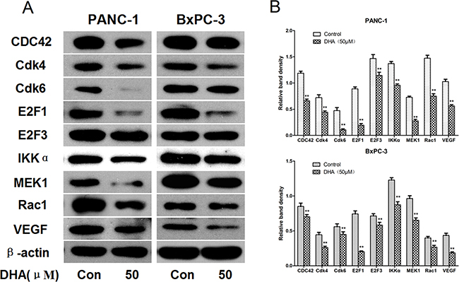Western blots revealed that Cdk4, Cdk6, VEGF, IKKα, MEK1, E2F3, Rac1, E2F1, and CDC42 levels decreased in PANC-1 and BxPC-3 cells that were treated with 50 μM DHA for 72 h (Figure 6). Similar results were obtained in SW1990 and CFPAC-1 cells (Supplementary Figure S3).