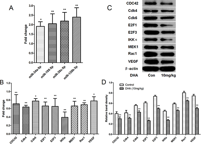 To confirm the results of microarray experiments and mRNA data obtained from the experimentally validated databases, all of the microRNAs (miR-34a-5p, miR-195-5p, miR-30c-5p, and miR-130b-3p) that were up-regulated by DHA, suppressed growth and angiogenesis, and promoted apoptosis in pancreatic cancer cells, and their target mRNAs (Cdk4, Cdk6, VEGF, IKKα, MEK1, E2F3, Rac1, E2F1, and CDC42), were analyzed with qRT-PCR.