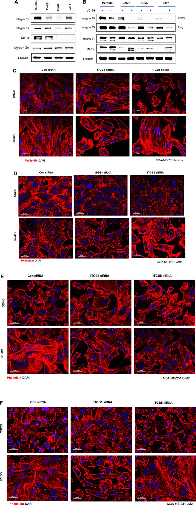 Figure 4: Integrin β1 mediates stress fiber formation and AKT activation following MEK inhibition. (A) Parental and metastatic cells were extracted with lamelli 2X sample buffer and immunoblotted with indicated antibodies against Integrin β1, Integrin β5 and MLCK. α-tubulin was used for protein loading control. (B) Prior to analysis of western blot, cells were incubated with either DMSO or 25 μM UO126. The cell extracts were collected with 2× lamelli sample buffer and immunoblotted with indicated antibodies against Integrin β1, Integrin β5 and MLCK respectively. (C–F) LM2, Parental, BoM2, and BrM2 cell lines were transfected for 48 hr with control siRNA, Integrin β1 siRNA, or Integrin β5 siRNA and then incubated with either DMSO or 25 μM UO126 for 48 hr. Cells were fixed and stained with phalloidin (Red) to visualize actin filaments. Nuclei were stained with DAPI (blue).