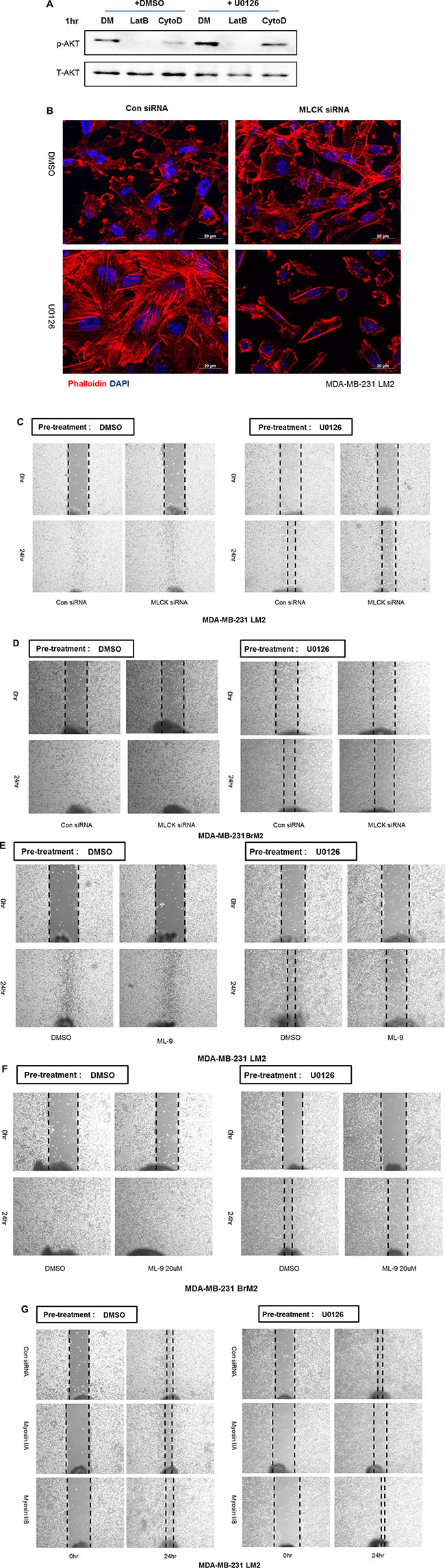 Figure 6: MLCK mediates actin cytoskeleton organization and motility following MEK suppression. (A) Prior to analysis by western blot, cells were treated with either DMSO or 25 μM UO126 for 48 hr. Cell extracts were collected with 2× lamelli sample buffer and immunoblotted with indicated antibodies against p-AKT(S473) and AKT. α-tubulin was used for protein loading control. Cells were treated with Latrunculin B (5 μM) or Cytochalasin D (1 μM) for 1 hr after pre-incubation of either DMSO or UO126 25 μM for 48 hr. (B) Control siRNA or MLCK siRNA was transfected in LM2 cells prior to treating with either DMSO or UO126 (25 μM). After an additional 48hr incubation of drug treatment, LM2 cells were fixed and stained. DAPI and Rhodamine conjugated phalloidin were used for staining nuclei and actin filaments respectively. (C–D) LM2 and BrM2 cells were transfected with either control siRNA or MLCK siRNA for 48 hr. Cells were then treated with either DMSO or 25 μM UO126 for additional 48 hr. (E–F) LM2 and BrM2 were pre-incubated with either DMSO or 25 μM UO126 for 48 hr. After pre-incubation, DMSO or ML-9 was then acutely added in fresh culture media. (G) LM2 cells were transfected with control, myosin IIA or IIB siRNA and incubated for 48 hr. After transfected siRNA, cells were then pre-incubated with either DMSO or 25 μM UO126 for an additional 48 hr. Cells were scraped by 200 ul tip and added in fresh media with either DMSO or 25 μM UO126 for wound healing migration assay.