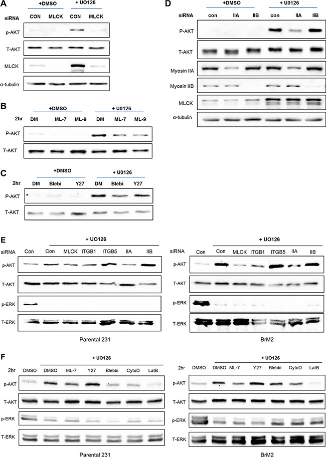 Figure 7: MLCK and Myosin IIA are required for PI3K-AKT activation following MEK suppression. (A) Control siRNA or MLCK siRNA were transfected in LM2 cells prior to treating with either DMSO or UO126 (25 μM). After an additional 48 hr incubation of drug treatment cells were collected with 2× lamelli sample buffer and immunoblotted with antibodies against phosphorylated AKT, AKT, MLCK. α-tubulin was used for protein loading control. (B) LM2 cells were treated with pharmacological inhibitors of MLCK, ML-7 and ML-9 respectively pre-incubated in either DMSO or 25 μM UO126 for 48 hr. (C) LM2 cells were acutely treated with Blebbistatin (50 μM) or Y27632 (20 μM) for 2 hr, which is pharmacological inhibitors of myosin II and ROCK respectively pre-incubated in either DMSO or 25 μM UO126 for 48 hr. (D) LM2 cells were transfected with either control siRNA or specific myosin II isoform, IIA and IIB respectively. After transfected, cells were incubated with DMSO or 25 μM UO126 for an additional 48 hr. (E) Prior to western blot analysis, Parental and BrM2 were pre-treated with UO126 for 48 hr. Then, cells were treated with various actin cytoskeleton disrupting drugs including ML-7 (20 uM), Y27632 (10 uM), Blebbistatin (50 uM), Cytocalasin D (1 uM) and Latruculin B (5 uM) for 2 hr. (F) Parental and BrM2 cells were transfected with individual siRNA against MLCK, integrin β1, integrin β5, myosin IIA and myosin IIB. After then Cells were treated with UO126 for 48 hr. AKT activation was measured by immunoblotting with phosphorylated AKT antibody detecting S473 phosphorylation.
