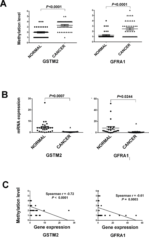 Figure 3: The strip plot shows the different methylation level and mRNA expression level in two groups and their integrated analysis of two genes. A. The strip plot shows the significantly different methylation level of two genes, GFRA1 and GSTM2. Methylation level 1 to 6 represents the methylation intervals: 0–10%, 11–25%, 26–50%, 51–75%, 76–85%, and 86–100%. B. The strip plot shows the significantly mRNA expression fold change of two genes. C. Pearson correlations of two genes were used to measure linear relationships between gene methylation (y axis) and gene expression level (x axis).