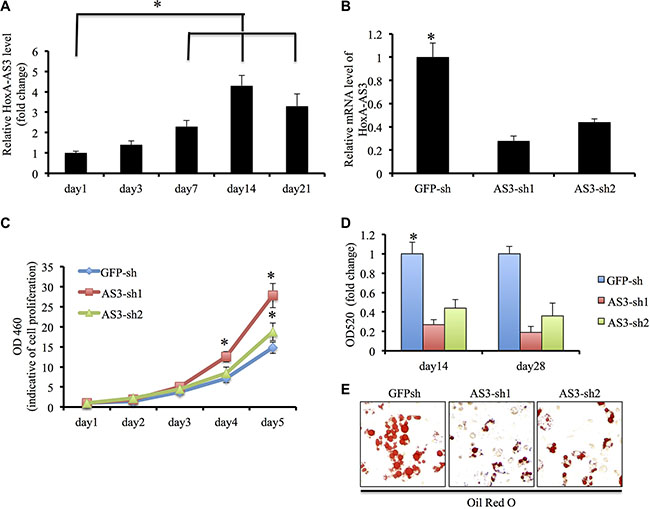 Figure 1: HoxA-AS3 is required adipogenesis of human MSCs. (A) Transcript of HoxA-AS3 was upregulated in human MSCs upon adipogenic differentiation. (B) Human MSCs infected with HoxA-AS3-sh1 or HoxA-AS3-sh2 lentivirus reduced mRNA expression levels of HoxA-AS3 compared to control human MSCs infected with GFP-sh lentivirus (C) Knockdown of HoxA-AS3 promoted the proliferation of human MSCs. (D) Human MSCs infected with GFP-sh, HoxA-AS3-sh1 or HoxA-AS3-sh2 lentivirus were cultured in adipogenic medium for 14 and 28 days. Lipid-containing cells were stained with Oil Red O. (E) Quantification of Oil Red O indicated the significant lower OD520 values between HoxA-AS3 knockdown groups in comparison with control groups. (*P < 0.05).