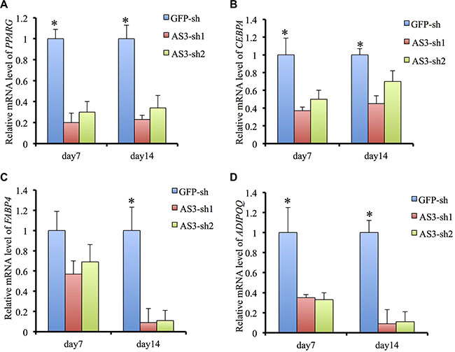 Figure 2: HoxA-AS3 is required for adipogenesis and adipogenic gene expression. (A) Real-time analysis of PPARG from GFP-sh hMSCs, HoxA-AS3-sh1 and HoxA-AS3-sh2 hMSCs after 7 or 14 days of adipogenic induction. (B) Real-time analysis of CEBPA from GFP-sh hMSCs, HoxA-AS3-sh1 and HoxA-AS3-sh2 hMSCs after 7 or 14 days of adipogenic induction. (C) Real-time analysis of FABP4 from GFP-sh hMSCs, HoxA-AS3-sh1 and HoxA-AS3-sh2 hMSCs after 7 or 14 days of adipogenic induction. (D) Real-time analysis of ADIPOQ from GFP-sh hMSCs, HoxA-AS3-sh1 and HoxA-AS3-sh2 hMSCs after 7 or 14 days of adipogenic induction. The relative expression fold was normalized to GAPDH and calculated with ΔΔCt methods. Each experiment was performed on 3 independent samples. The data represent mean ± SD. (*P < 0.05).