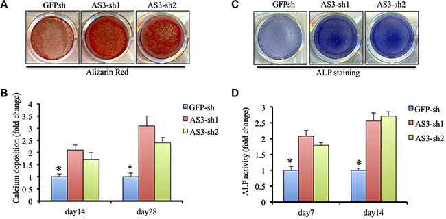 Figure 3: HoxA-AS3 inhibited osteogenesis of human MSCs. (A) Alizarin Red S staining of GFP-sh hMSCs, HoxA-AS3-sh1 and HoxA-AS3-sh2 hMSCs cultured in osteogenic medium for 14 or 28 days. (B) Quantitative colorimetric results for ARS staining. (C) ALP staining of GFP-sh hMSCs, HoxA-AS3-sh1 and HoxA-AS3-sh2 hMSCs cultured in osteogenic medium for 7 or 14 days. Each experiment was performed on 3 independent samples. (D) Quantitative results of ALP staining. The data represent mean ± SD. (*P < 0.05).