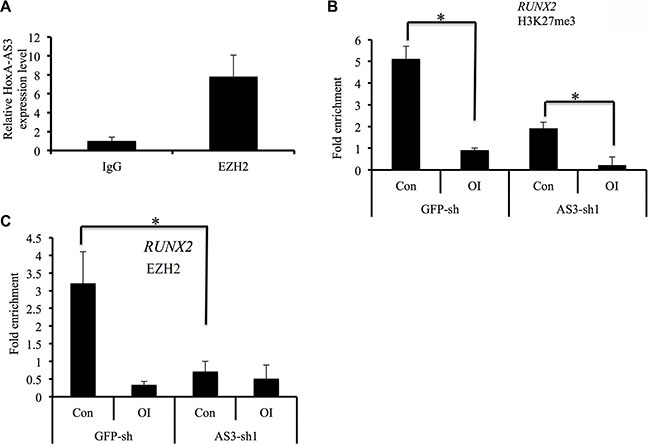 Figure 6: HoxA-AS3 is associated with EZH2 and regulates RUNX2 expression. (A) Immunoprecipitation of EZH2 retrieves endogenous HoxA-AS3. (B, C) ChIP-PCR analysis was conducted for the Runx2 promoter regions of HoxA-AS3-silencing or control hMSCs using H3K27me3 (B) and EZH2 (C) antibodies with or without osteogenic induction (OI). Relative enrichment to the input controls was calculated and shown. Data presented were average of three independent experiments expressed as the mean ± SD. *p < 0.05.