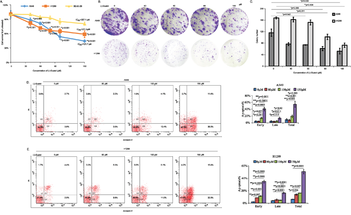 Figure 1: In vitro evaluation of antitumor activity of (-)-Guaiol in NSCLC cells. A. Cell survival analysis of NSCLC cells (A549 and H1299) and normal lung cells BEAS-2B cells treated with different concentrations of (-)-Guaiol using CCK8 assays. Data from three independent experiments were represented as means ± STD. IC50 values were 121.7 μM for A549 cells, 211.5 μM for H1299 cells, and 297.1 μM for BEAS-2B cells, respectively. B-C. Colony formation assays of inhibition roles of (-)-Guaiol on A549 cells and H1299 cells (B). Colony numbers from three independent experiments were statistically analyzed using ANOVA tests (C). D-E. Flow cytometry assays of cell apoptosis of A549 (D) and H1299 (E) cells treated with indicated concentrations of (-)-Guaiol. Data from three independent experiments were represented as means ± STD and subjected to ANOVA tests, respectively.